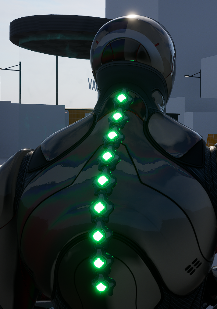 One of my main goals when starting this project were to create an interface that felt truly alive; something that the user could almost reach out and touch. To achieve this, I created a diegetic interface pipeline that allowed me to design and iterate on various elements for the project. This can best be seen in the spinal health meter and the holographic mini map.